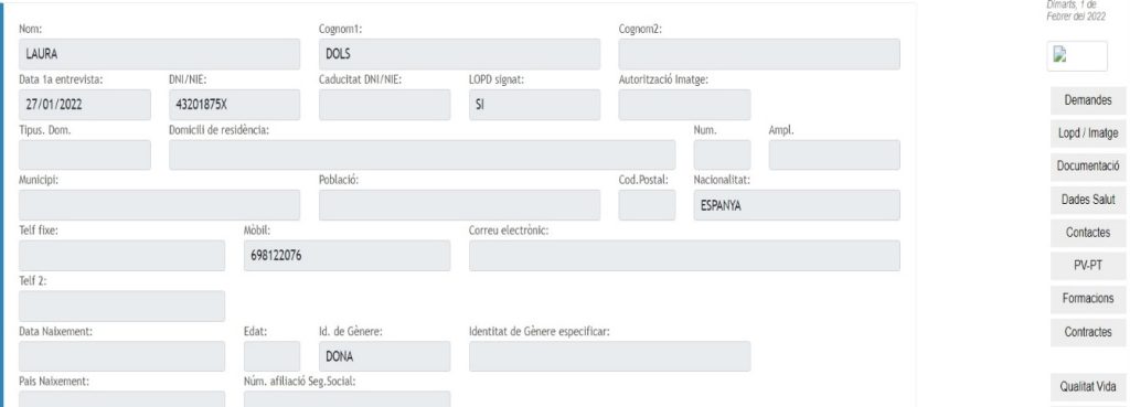 A més, recalcar, que si volem que la informació sobre ingressos econòmics tingui en compte els obtinguts a través de la condició treballadora de la persona és necessari que s’introdueixi la quantitat perceptora a través de l’espai ‘Sou mensual’ que trobem a la pantalla de contractes.
