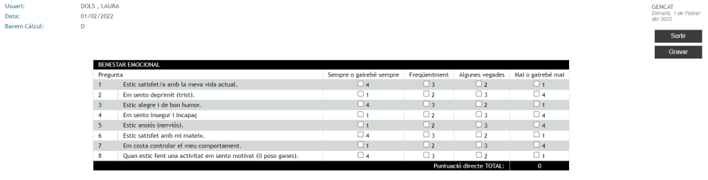 ens permetrà registrar les respostes de cada una de les dimensions. Cada vegada que completem les respostes d’una dimensió hem de gravar i passar a la següent.