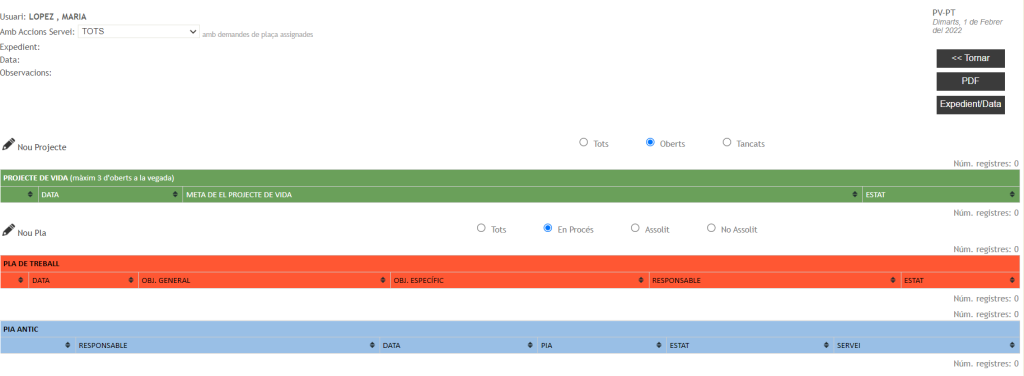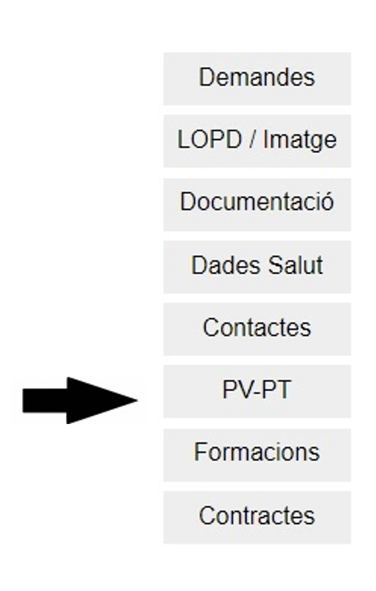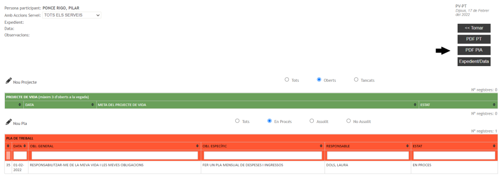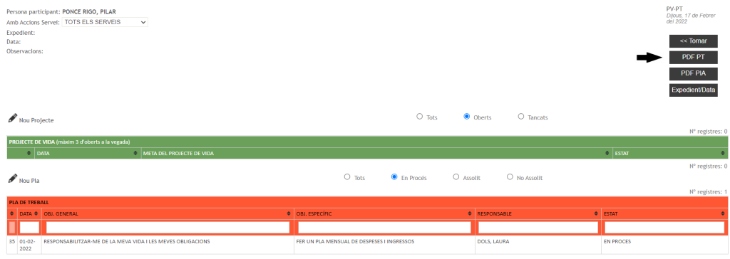 Per registrar el projecte de vida de la persona participant, anem a la pantalla general de la persona participant i als botons de la dreta trobem PV-PT.