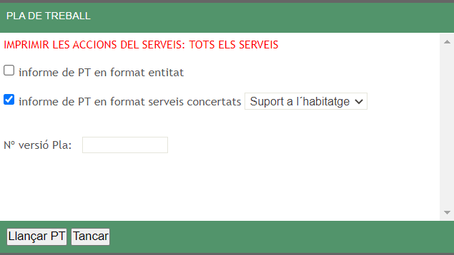 Ens apareixerà la següent pantalla on hem de seleccionar el servei des del qual es realitza el pla de treball per tal que s’impreixi amb els logos que corresponen.