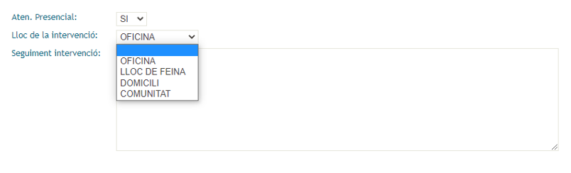 A continuació, es podrà seleccionar de d’un desplegable si l’atenció ha estat presencial o no, y a la vegada, a través d’un nou desplegable el lloc on s’ha realitzat la intervenció.