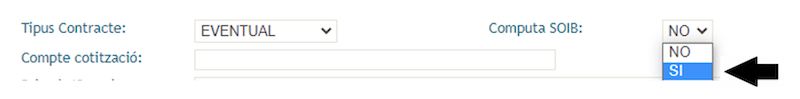 En el cas específic de que la persona participi en algun dels programes ‘Soib’ o ‘Soib Jove’ i que sigui una contractació que computi a efectes estadístics de inserció en l’execució d’aquests, haurem d’assegurar-nos de marcar la opció SI en el desplegable ‘Computa SOIB’: