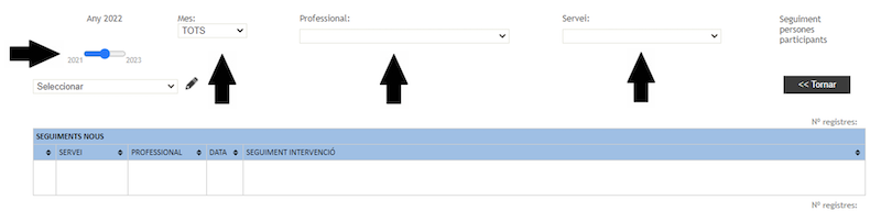 Una vegada accedim a la pantalla de seguiments ens permet llegir aquells seguiments que s’han fet al llarg de la participació de la persona en qualsevol dels serveis de la entitat, on podrem a més, filtrar per l’any, mes, professional o servei que va fer el seguiment a través dels diferents desplegables: