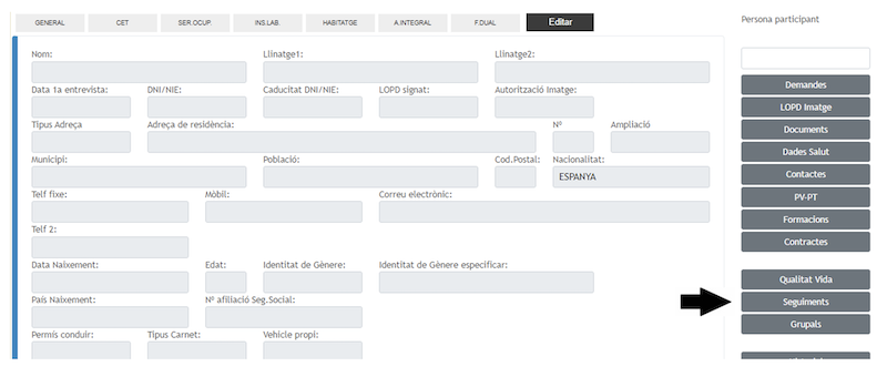 El botó de seguiments, al costat lateral dret de la fitxa de la persona participant, ens condueix a la pantalla que ens atorga la possibilitat d’introduir informació important i que permet tenir un seguiment cronològic sobre les persones que participen en el nostre servei i amb les quals treballem, servint a la mateixa vegada com a eina on els diferents professionals que treballen amb una mateixa persona poden fer constar tot allò que consideren rellevant i així facilitar la feina coordinada.