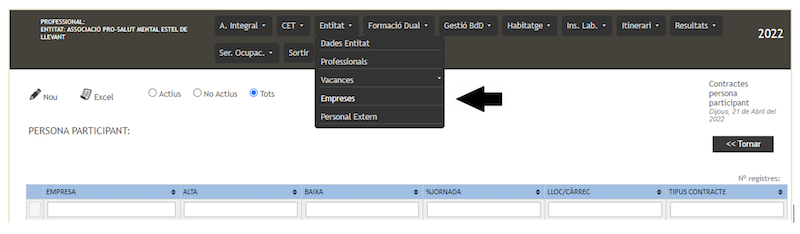 En el cas de ser una persona participant d’alguns dels serveis de l’entitat amb itinerari laboral, tindrem la opció de seleccionar des del llistat d’empreses introduïdes des de l’apartat ‘empreses’ des del menú desplegable superior ‘Entitat’.