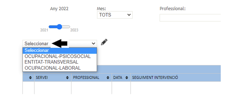 Per a introduir informació sobre quin tipus d’intervenció ha fet el/la professional amb la persona participant, comencem seleccionant des de quin servei, dels quals és participant, el professional està introduint la informació i cliquem sobre l’icona del llapis, com podem veure a continuació: