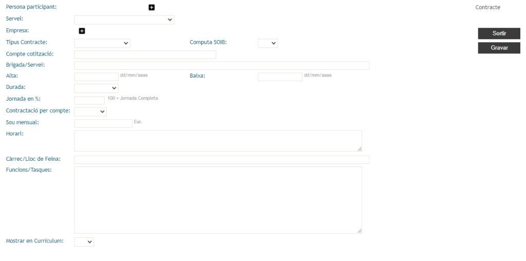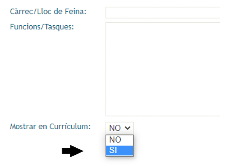 De la mateixa manera, si volem que aquesta experiència laboral aparegui al CV de la persona, haurem d’haver emplenat degudament les dades de contractació (inici, final, empresa, etc.) i, finalment clicar sobre la opció ‘Si’ de l’apartat ‘Mostrar en Currículum’: