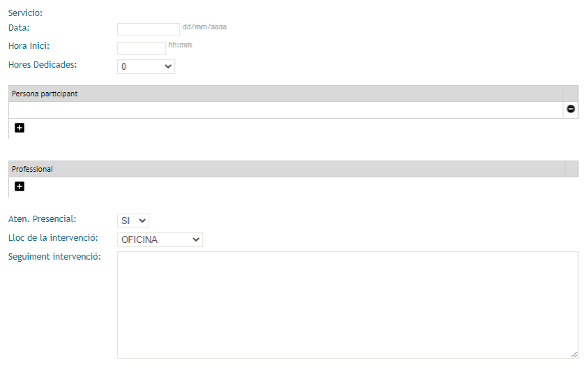 A continuació, podrem seleccionar la persona participant sobre la qual farem el seguiment i el professional del servei que s’encarrega de dur-ho a terme. Per a fer-ho, clicarem al botó