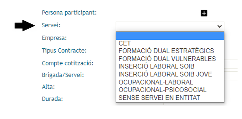 El primer de tot és seleccionar, el servei des del que participa la persona participant a través del desplegable ‘Servei’, en cas de no participar en un servei d’itinerari laboral, s’hauria de seleccionar la opció ‘sense servei en entitat’: