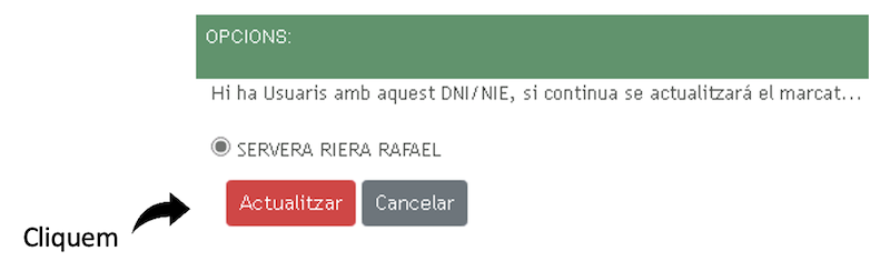 Si la persona sí que ha estat a l’entitat, la BdD ens indicarà que ja existeix una persona amb aquest DNI/NIE i que hem d’actualitzar la informació.