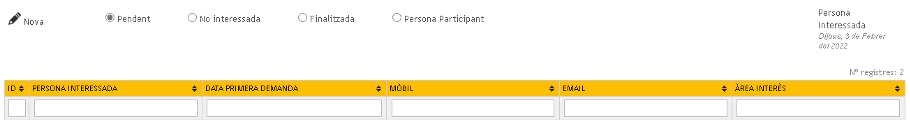 Una vegada hem convertit a la persona interessada en persona participant, arribem a la pantalla de demandes.